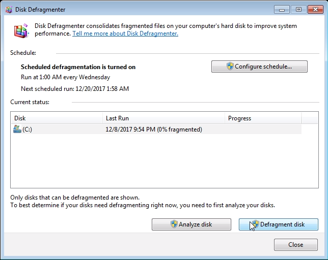10. Tắt hộp thoại Disk DefragmentControl Panel.